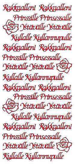 Ihania ääriviivatarroja punaisilla teksteillä joissa kultaus.