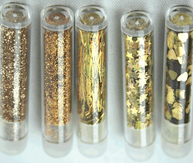 5kpl miniputkiloita sisältää kullan värisiä koristeita ja hilettä askarteluun.