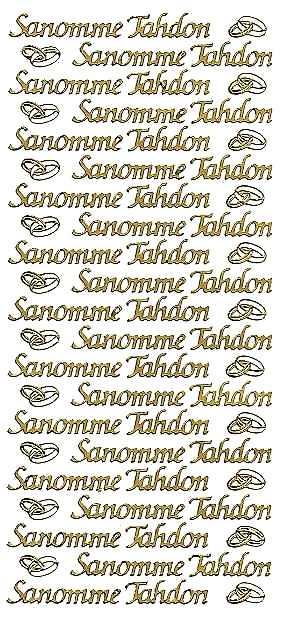 Ääriviivatarra jossa kultaisia tekstejä "Sanomme Tahdon", sekä sormustarroja.
