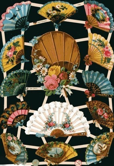 Kukkasin koristellut viuhkat kiiltokuvina.