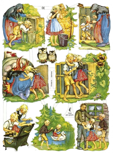 Hannu ja Kerttu sadun aiheet kiiltokuvina.