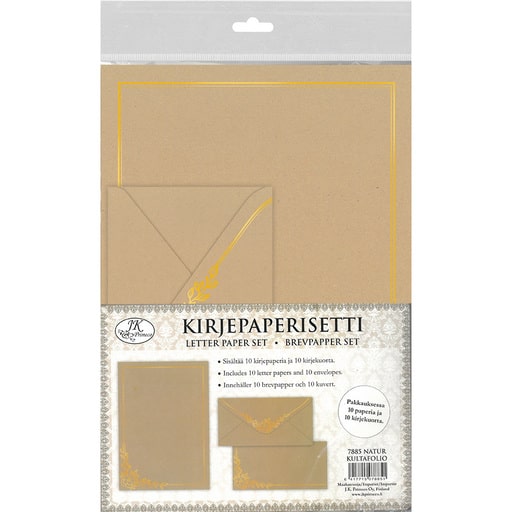 Pakkaus sisältää 10 kirjepaperia, 10 kirjekuorta ja yhden viivapaperin.